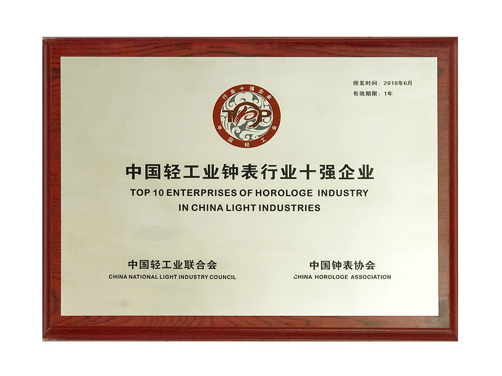 Rarone honored  “Top 10 ENTERPRISES OF HORLOGE INDUSTRY IN CHINA LIGHT INDUSTRIES”